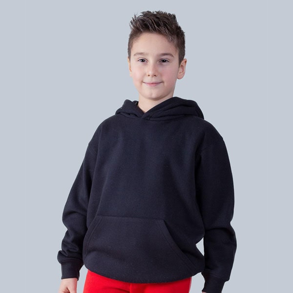 Felpa da bambino con maniche set-in, unisex a tre strati, felpata internamente, cappuccio a doppio strato, grande tasca a marsupio, struttura con cuciture laterali, fascia in vita e polsini in costina, tessuto PST. Etichetta strappabile.