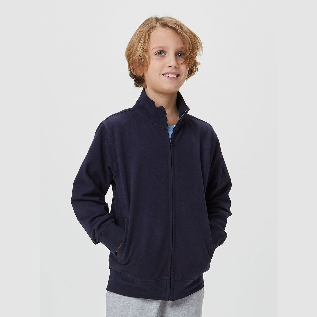 Felpa french terry da bambino con zip intera, maniche set-in, collo alto, tasche a filetto. Orlo inferiore e polsini in costina elasticizzata, struttura con cuciture laterali. Etichetta strappabile. Parte esterna: 100% cotone, parte interna: 50% cotone, 50% poliestere. Il trattamento peach finish rende il tessuto ancora più morbido al tatto.