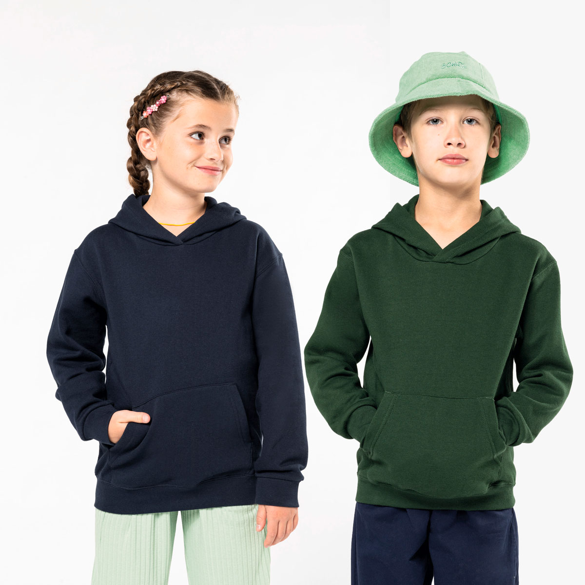 Felpa garzata. Maniche a giro. Cappuccio foderato. Tasche a canguro. Fondo manica e fondo capo a costine. Certificato STANDARD 100 by OEKO-TEX® N° CQ 1007⁄7, IFTH.