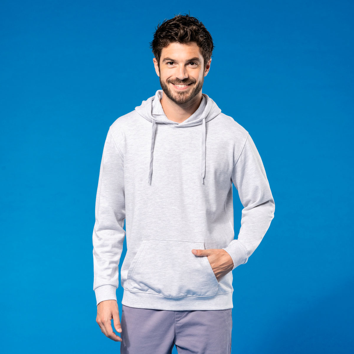 Felpa garzata. Maniche a giro. Cappuccio foderato con coulisse tono su tono. Tasche a canguro. Fondo manica e fondo capo a costine. Certificato STANDARD 100 by OEKO-TEX® N° CQ 1007⁄7, IFTH.