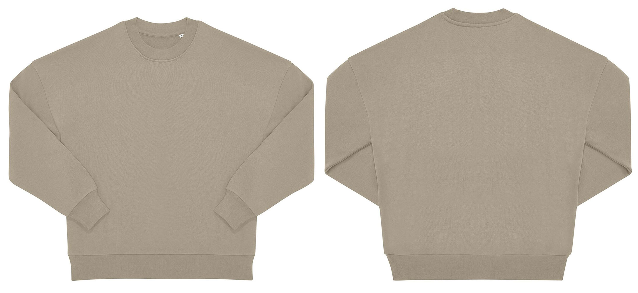 Felpa girocollo, spalle scese e taglio oversize, gender-neutral, tessuto PST, felpata internamente, sensazione lussuosa al tatto, senza etichetta.