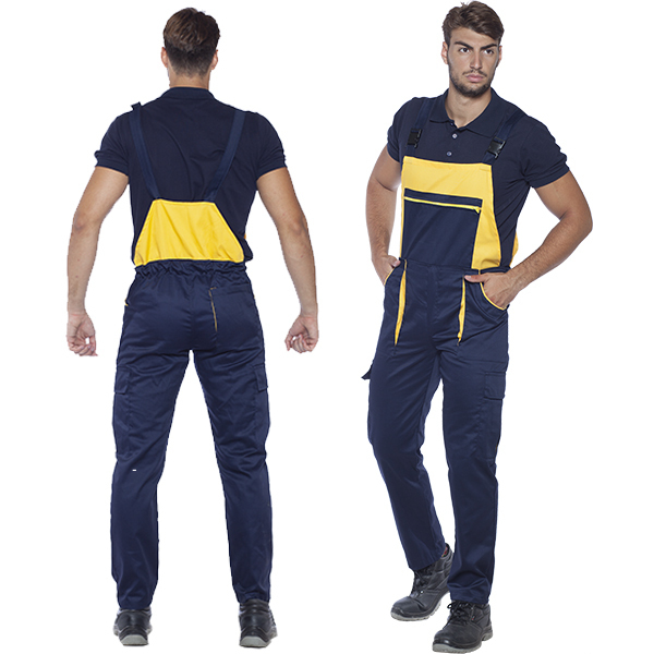 Modello Unisex - taglie dalla XS alla XXL - Blu Navy disponibile anche nella XXXL - Tasca su pettorina chiusa con zip cm 19×17 - 2 multitasche su gamba -Bretelle in tessuto + elastico e moschettone regolatore in plastica UNI EN ISO 13688:2013 Prima categoria